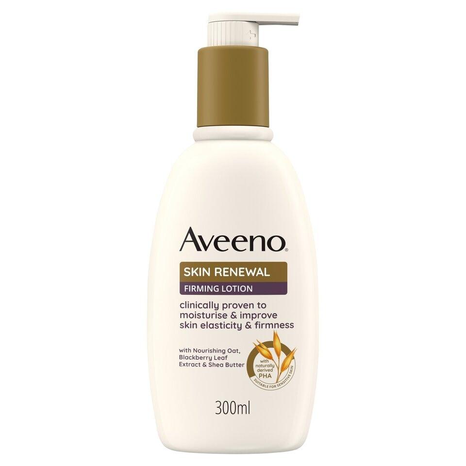 Aveeno Skin Renewal Firming Body Lotion Moisturiser 300mlAveeno® Skin Renewal Firming Lotion is clinically proven to hydrate, smooth & improve skin firmness & elasticity. For visibly renewed & younger-looking skin.Care for SkinFormula with nourishing oat, naturally derived PHA & blackberry leaf extract, to help promote skin renewal & visibly firm the skin.- Nourishing oat: Hydrates skin- Naturally derived PHA: Gentle chemical exfoliant- Blackberry leaf extract: Known to help enhance collagen & elastin recovery- Clinically proven suitable for sensitive skin- Fast absorbing.- Hypoallergenic**formulated to minimise the risk of allergy© 2023Dermatologist TestedClinically proven to moisturise & improve skin elasticity & firmnessSmooths and softens rough skinFragrance freeWith nourishing oat, blackberry leaf extract & shea butterWith naturally derived PHASuitable for Sensitive SkinPack size: 300ML
