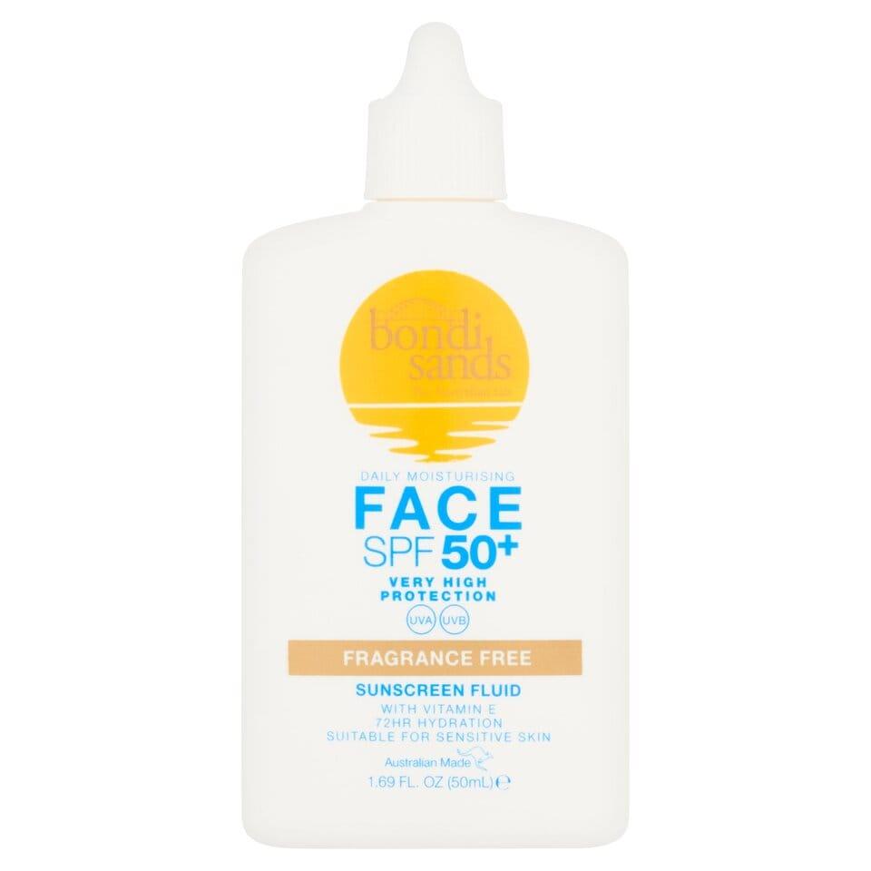 Bondi Sands F/F Face Sunscreen Fluid Spf50 50ml Enjoy a sun-soaked day the Bondi Sands way with our fragrance free SPF 50+ face fluid. Providing UVA and UVB protection, this ultra lightweight face fluid is gentle, fast absorbing and dries to an invisible finish. Can be worn alone or under makeup.Bondi Sands is a registered trademark of Bondi Sands Pty Ltd.Very High ProtectionUVA UVBUVA ***** UltraFragrance FreeWith Vitamin E72hr HydrationSuitable for Sensitive SkinDermatologically testedNon-comedogenic - wont clog poresCruelty free and veganPack size: 50ML
