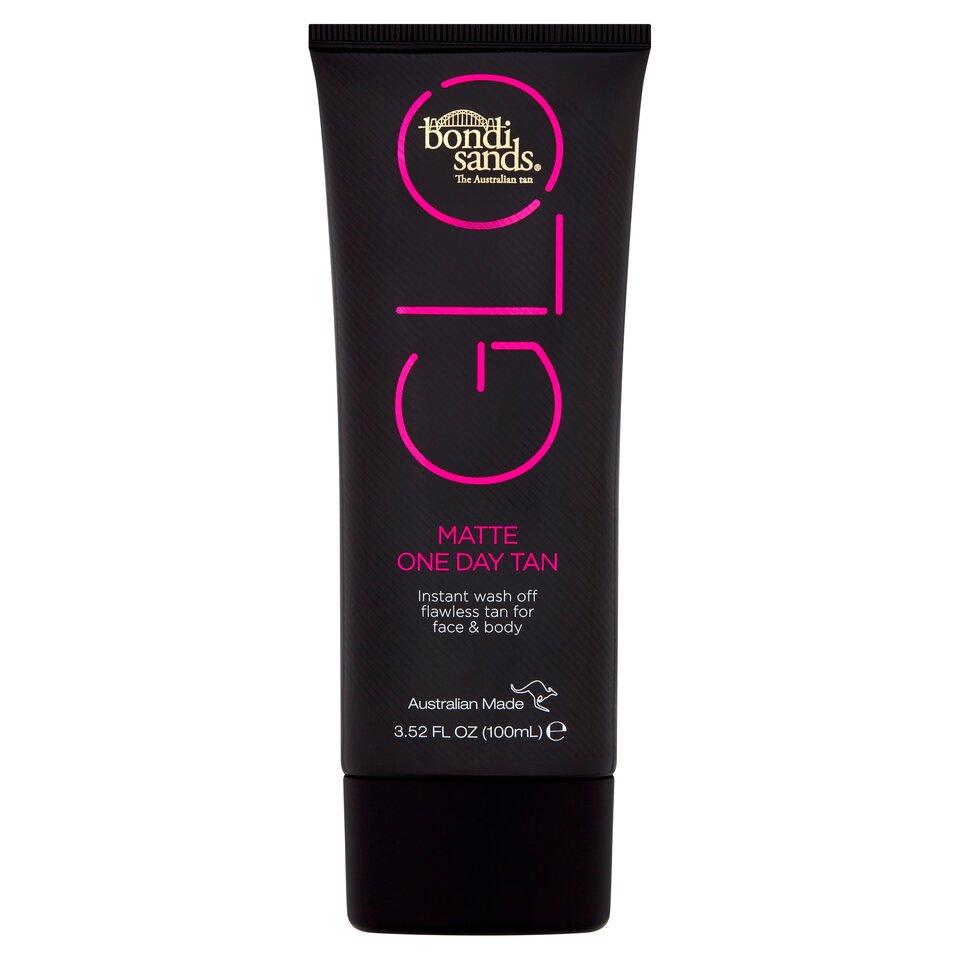 Bondi Sands Glo Matte One Day Tan 100ml Get a sunkissed glow in an instant with Bondi Sands Matte One Day Tan. Our skin perfecting formula glides on effortlessly, giving you a flawless bronze finish. Transfer and water resistant, this high coverage formula is perfect for face and body and easily washes off with soap and warm water.Please recycle packaging.Bondi Sands is a registered trademark of Bondi Sands Pty Ltd.The Australian tanInstant wash off flawless tan for face & bodyAustralian madeNot tested on animalsPack size: 100ML