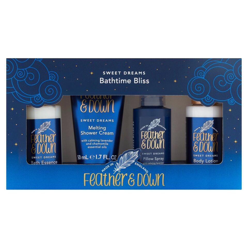 FEATHER & DOWN BATHTIME BLISS GIFT SET Sleep MattersCreate a relaxing bathroom sanctuary with our lavender and chamomile infused Bath Essence and Shower Cream.Complete your Bathtime Bliss routine with our moisturising body lotion and award winning pillow spray to help aid a restful nights sleep.Cruelty freeNatural extractsDreamt of in EnglandVegan friendly